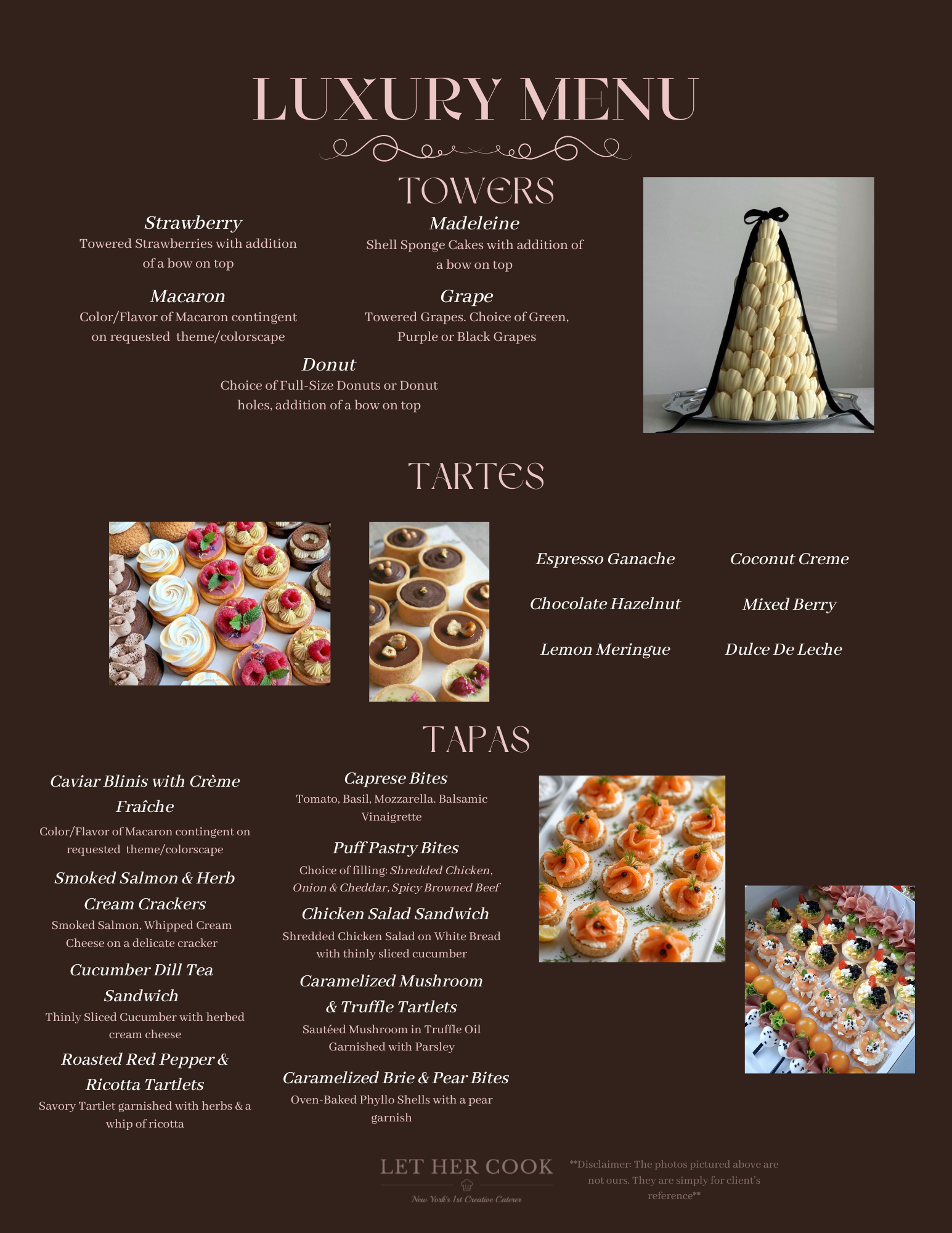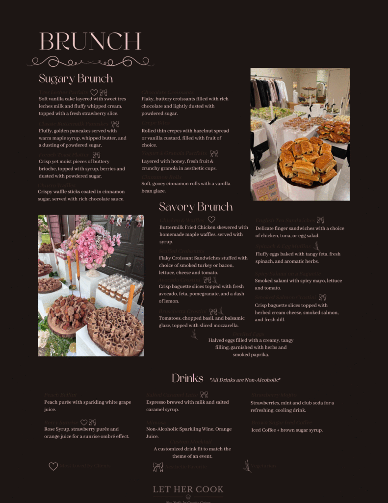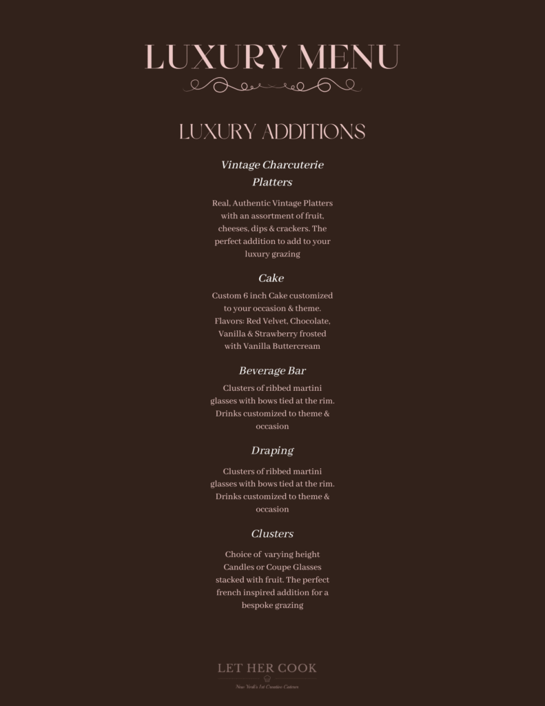 Let Her Cook is the New York Metro’s premier creative catering service, proudly serving the tri-state area, including New York, New Jersey, and Long Island. We believe that great food should not only taste incredible but also be a visual delight. That’s the essence of what we do – combining culinary excellence with stunning presentation to make every event truly memorable.